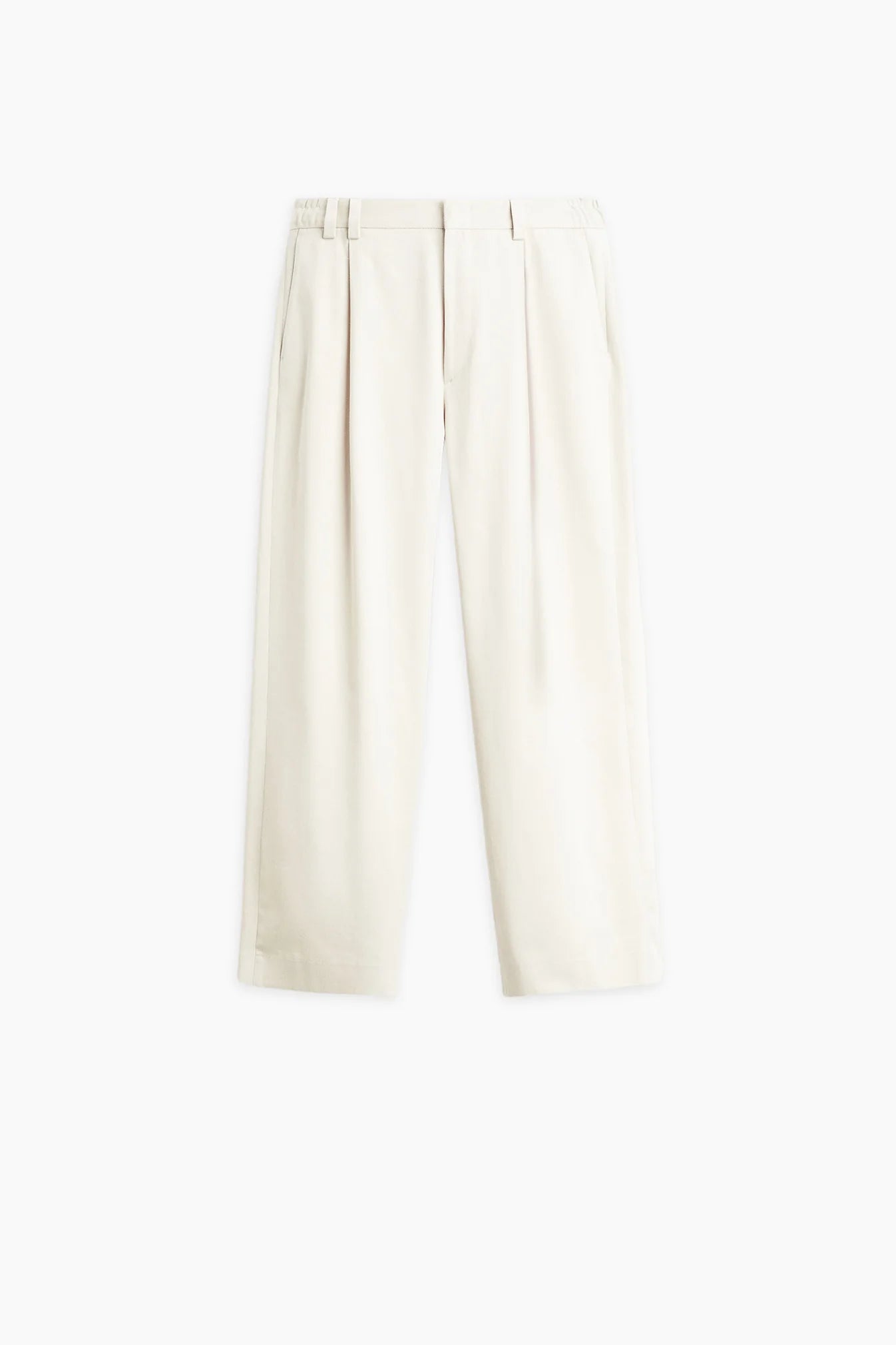 These beige pleated trousers, crafted from a wool and polyester blend, offer a relaxed fit with side elastic and belt loops for added comfort. Featuring front pleats and practical pockets, they seamlessly transition from formal to casual wear.