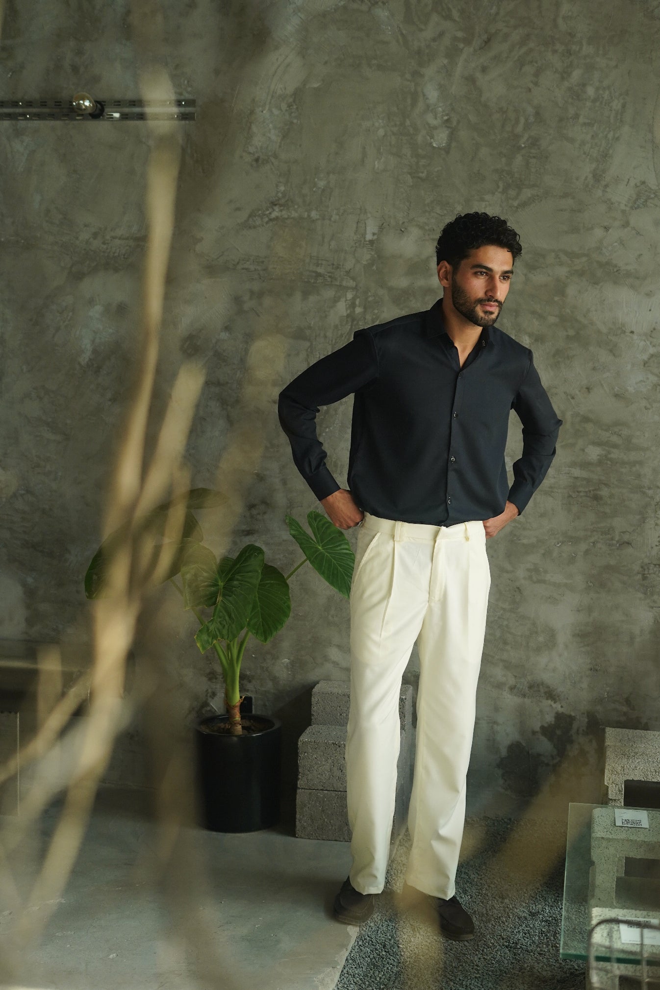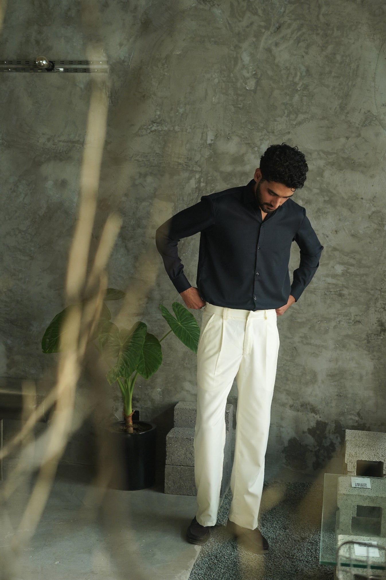 These beige pleated trousers, crafted from a wool and polyester blend, offer a relaxed fit with side elastic and belt loops for added comfort. Featuring front pleats and practical pockets, they seamlessly transition from formal to casual wear.