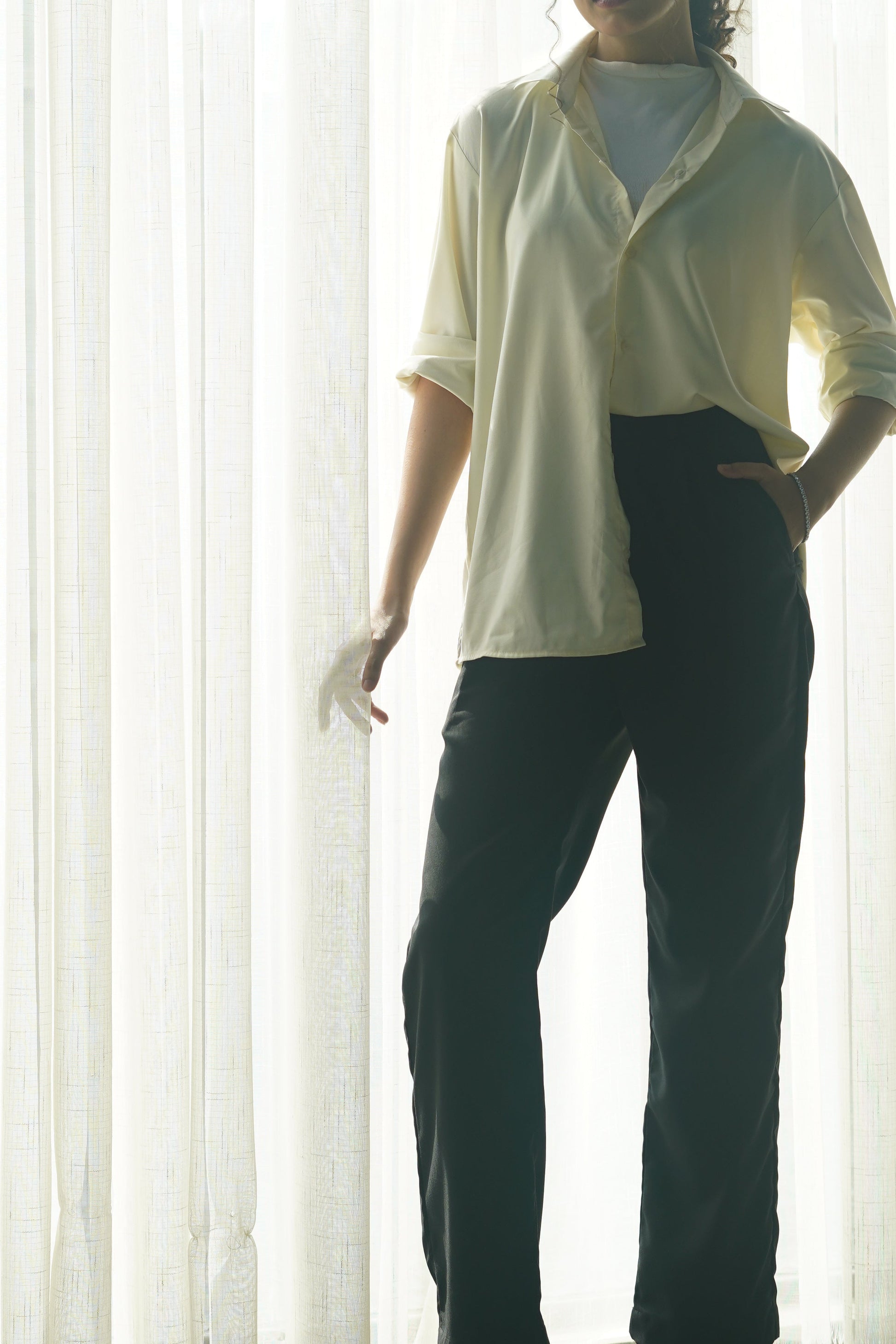 Our Black Pleated Trousers, made from a blend of wool and polyester, offer a loose, relaxed fit with side elastic and belt loops for extra comfort. With two front pleats, side pockets, and back welt pockets.