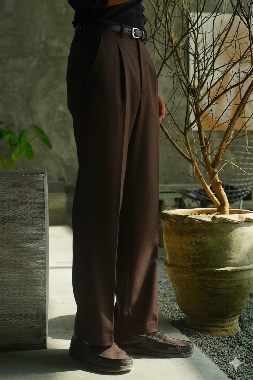 Loose-fit trousers crafted from a blend of wool & polyester. Designed with front pleats, belt loops, side pockets, and back welt pockets. Finished with a zip fly and top button fastening for a tailored yet relaxed look.