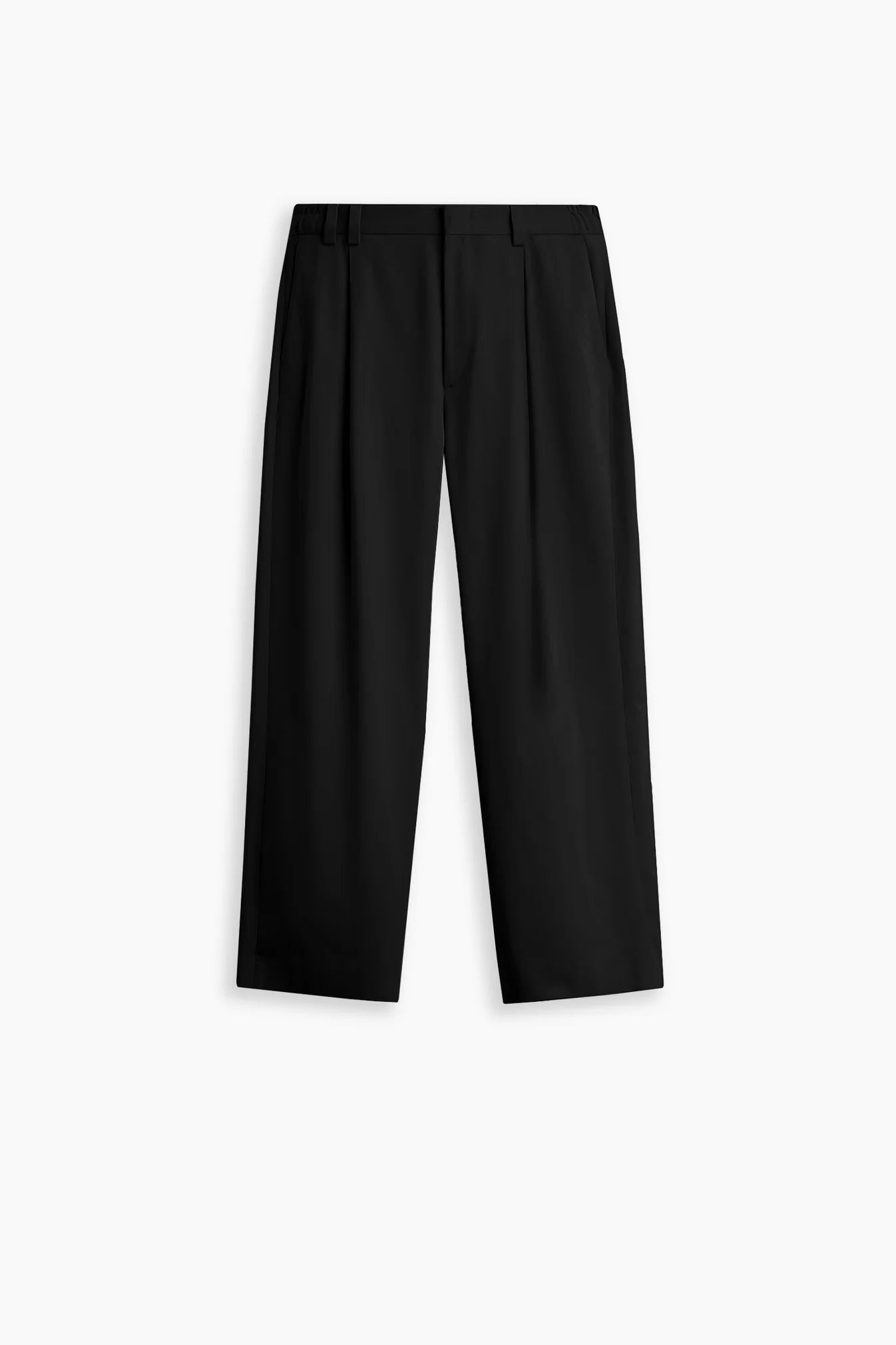 The brown polo shirt, crafted from a cotton and polyester blend, combines subtle texture with a sharp straight fit, making it ideal for any occasion. Pair it with beige pleated trousers made from a soft wool and cotton blend, offering a relaxed fit with side elastic and practical pockets for effortless style and comfort.