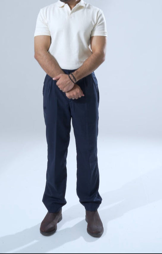 These navy blue pleated trousers feature a relaxed fit with side elastic and belt loops for added comfort. Designed with two front pleats, side pockets, and back welt pockets, they offer a versatile look that transitions seamlessly from formal to casual settings.